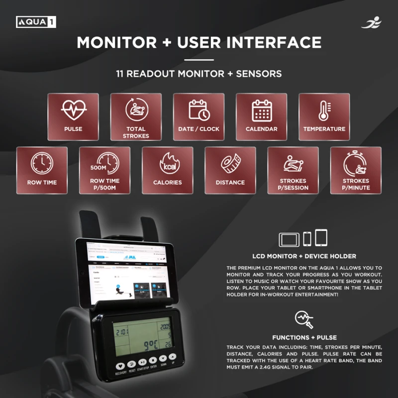 Engineered to support a maximum user weight of 150kg, this robust rower is built for durability and stability, ensuring a safe and effective workout for users of all fitness levels. The Aqua 1 features an 11-readout monitor, providing comprehensive feedback on your time, distance, speed, calories burned, strokes per minute, and more, helping you stay motivated and track your progress with ease.