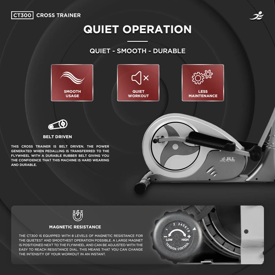 Benefits of Home Workouts: Enjoy the convenience and flexibility of home workouts with the JLL CT300 Cross Trainer. Save time and money by eliminating the need for a gym membership, and benefit from the ability to exercise on your own schedule. The compact and sleek design ensures it fits seamlessly into any home environment, while the quiet operation allows you to work out without disturbing others.