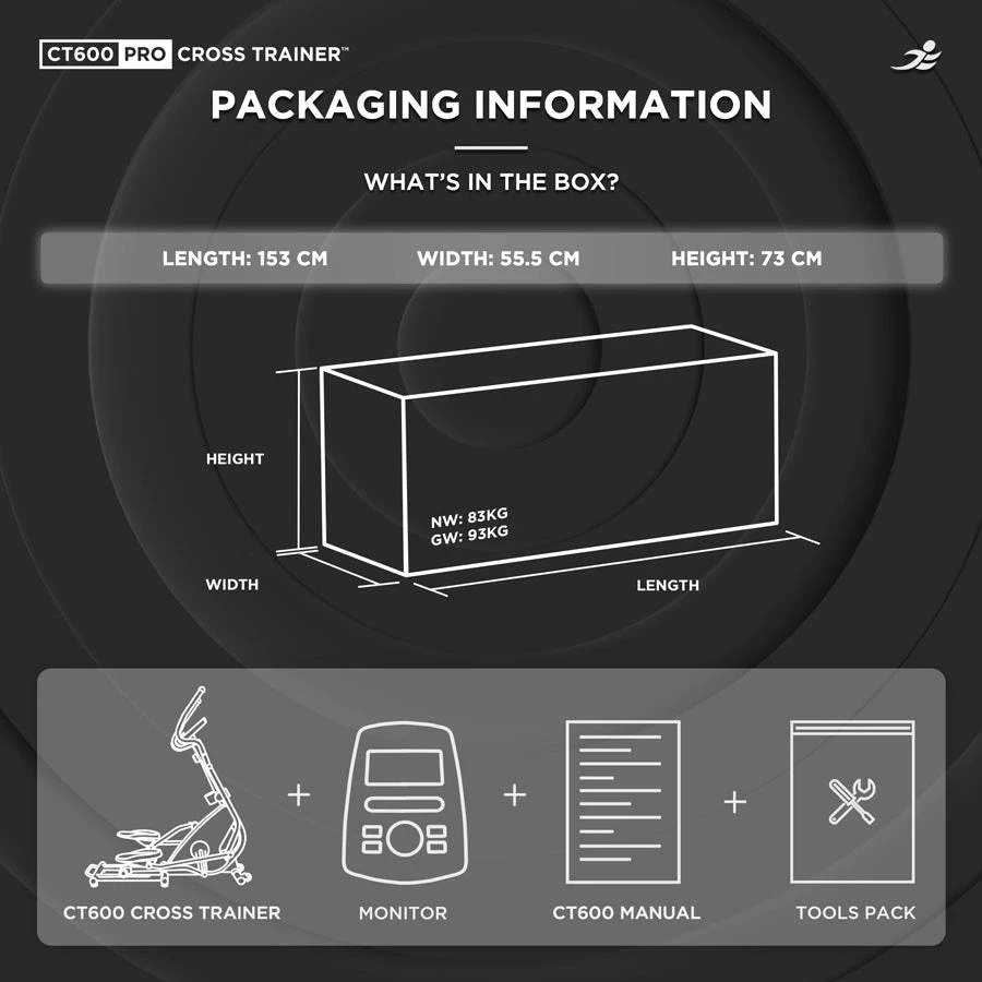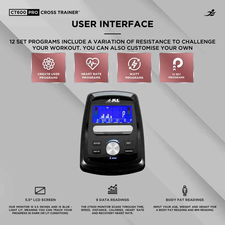Transform your fitness journey with the JLL CT600 Pro Cross Trainer. Combining top-tier technology, advanced features, and superior comfort, this high-end machine provides everything you need to achieve your health and fitness goals from the comfort of your home. Invest in the best and experience professional-grade workouts with the JLL CT600 Pro.
