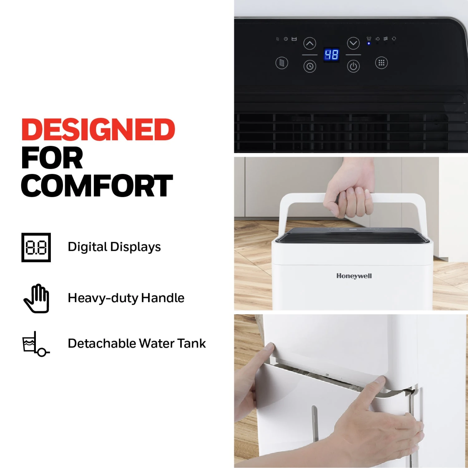 Take control of indoor moisture with the Honeywell TPFit25WK 25-Pint Energy Star Dehumidifier. This top-rated dehumidifier is designed for small to medium rooms. This sleek portable dehumidifier unit efficiently removes up to 25 pints of excess humidity per day. With Energy Star certification, Honeywell dehumidifier saves power while helping protect your home from mold, mildew, and musty odors. This top rated dehumidifier model features a washable dust filter, a continuous drain option, and a smart digital display for easy operation. With smooth-glide wheels and intuitive LED controls, this portable dehumidifier is a smart solution for bedrooms, basements, or offices in both U.S. and Canadian homes.