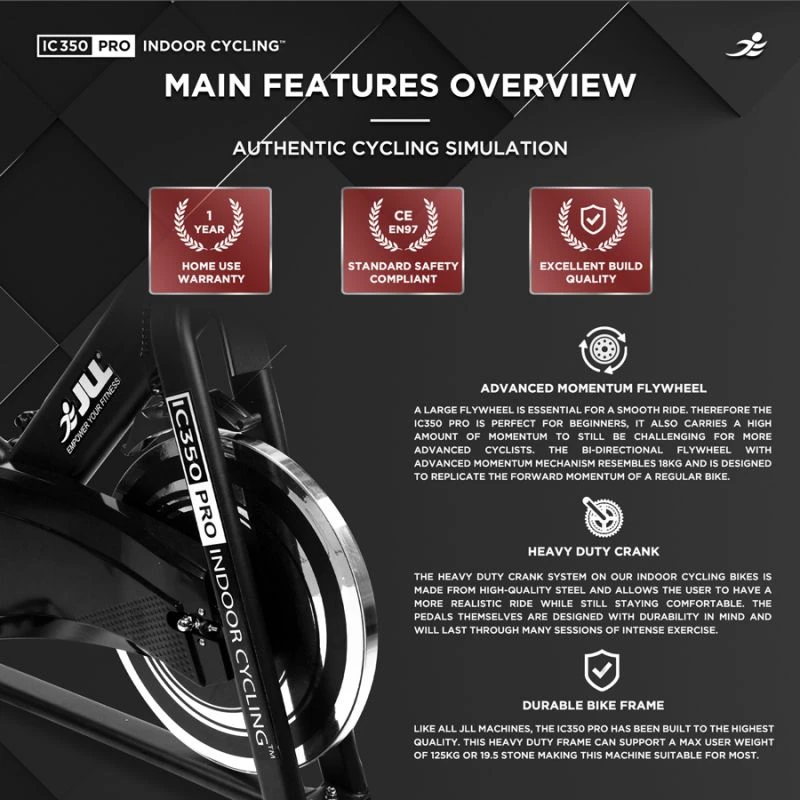 Introducing the JLL IC350 Indoor Cycling Bike, a mid-range solution that balances performance and affordability for your home workouts. This bike is equipped with a robust 7kg flywheel, providing a smooth and consistent ride suitable for various fitness levels. The IC350 features a 6-function monitor, allowing you to accurately track your time, speed, distance, calories burned, pulse, and RPM. Its adjustable magnetic resistance ensures a customisable workout experience, while the sturdy frame supports a maximum user weight of 125kg. The padded saddle and adjustable handlebars offer ergonomic comfort, making the JLL IC350 an excellent choice for those seeking a reliable and versatile indoor cycling experience.