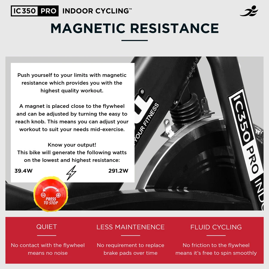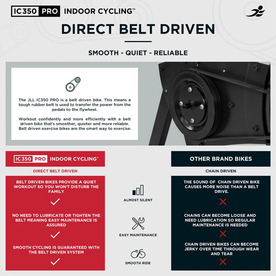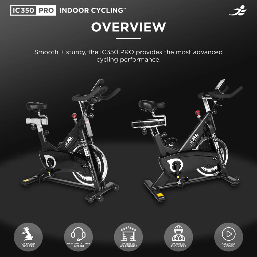 Introducing the JLL IC350 Indoor Cycling Bike, a mid-range solution that balances performance and affordability for your home workouts. This bike is equipped with a robust 7kg flywheel, providing a smooth and consistent ride suitable for various fitness levels. The IC350 features a 6-function monitor, allowing you to accurately track your time, speed, distance, calories burned, pulse, and RPM. Its adjustable magnetic resistance ensures a customisable workout experience, while the sturdy frame supports a maximum user weight of 125kg. The padded saddle and adjustable handlebars offer ergonomic comfort, making the JLL IC350 an excellent choice for those seeking a reliable and versatile indoor cycling experience.