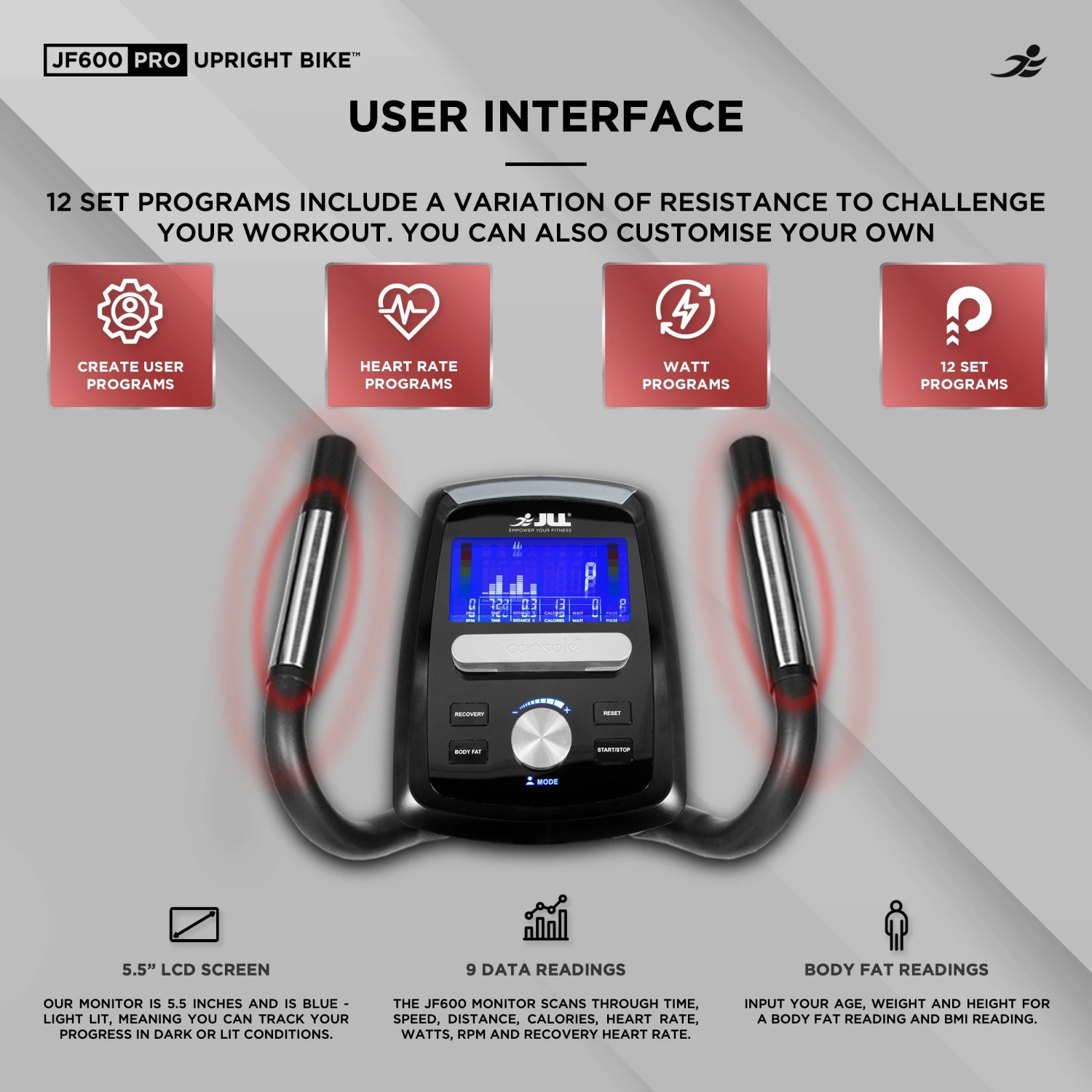 Diverse Workout Programs: The JF600 Pro offers 12 built-in workout programs, catering to various fitness levels and goals. Whether you aim to burn fat, improve endurance, or enhance cardiovascular health, these pre-set programs provide structured and effective routines to keep you engaged and challenged.