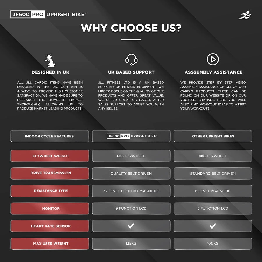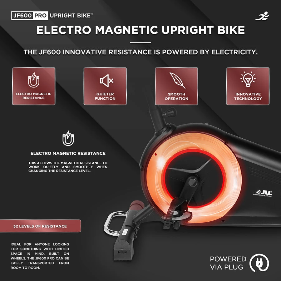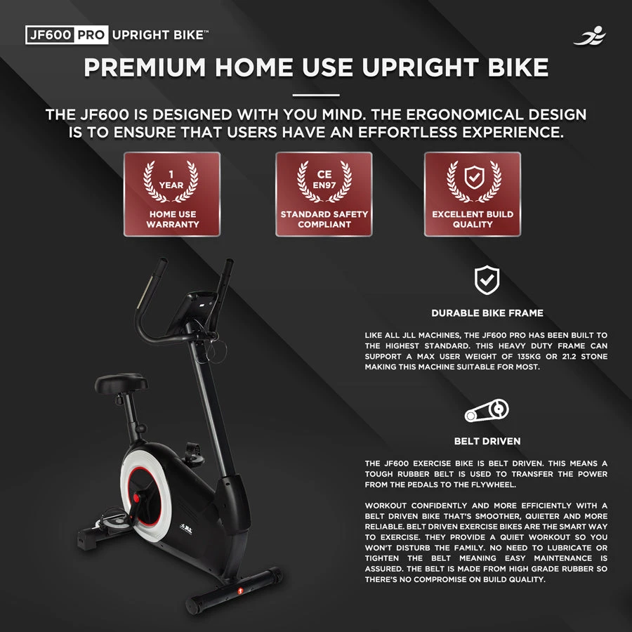 Achieve your fitness goals with the JLL JF600 Pro Upright Exercise Bike – where advanced technology meets exceptional comfort. Invest in the best for your home fitness routine and experience the benefits of professional-grade workouts in the comfort of your own space. Transform your health and fitness journey today with the JLL JF600 Pro.