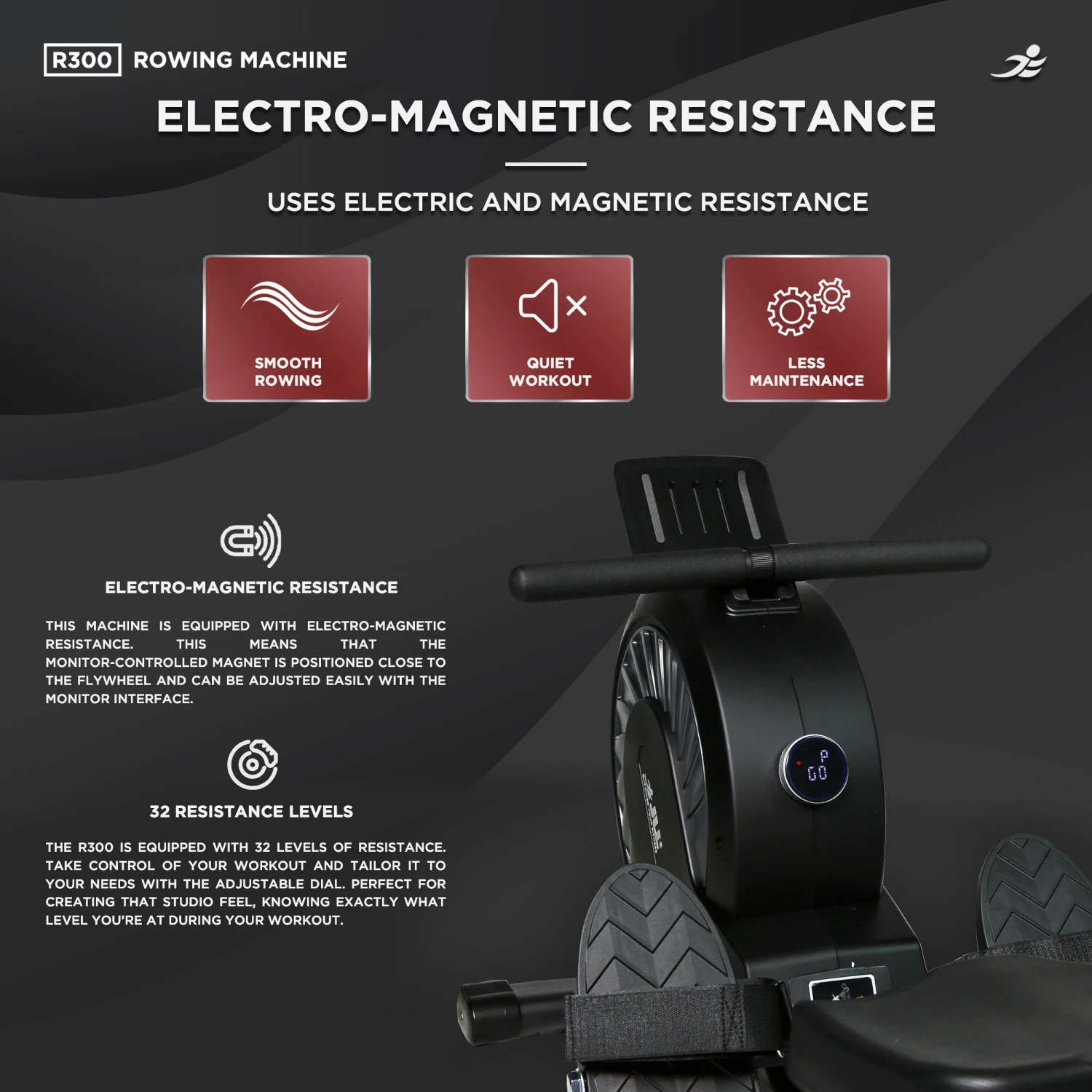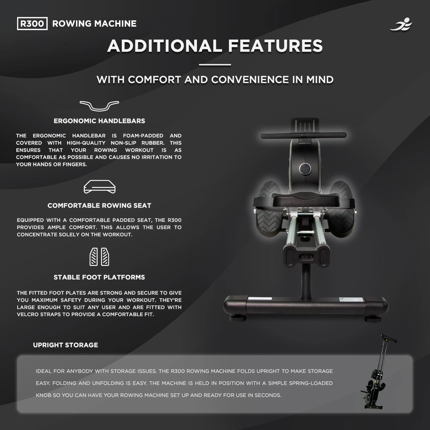 Crafted with a smooth aluminium slideway, this rowing machine delivers a fluid and natural rowing motion, ensuring a comfortable and efficient workout session every time. Whether you’re a beginner or an experienced athlete, the R300 adapts to your fitness level, providing challenging resistance to help you achieve your goals.