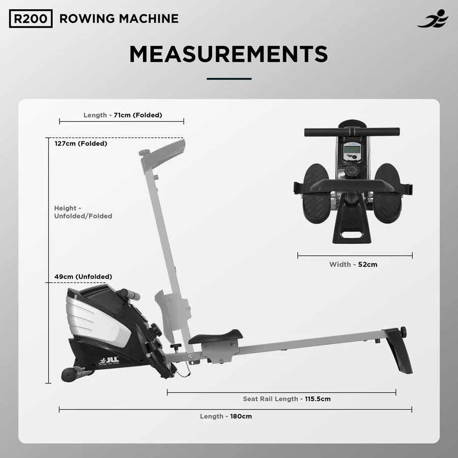 Introducing the JLL R200 Rowing Machine, the perfect entry-level rower designed to bring the benefits of a full-body workout into the comfort of your home. Equipped with a smooth and quiet magnetic resistance system, the R200 offers a range of resistance levels to cater to all fitness levels. This compact and durable rower ensures a stable and effective workout, making it an ideal choice for those looking to improve their cardiovascular health, build strength, and burn calories efficiently. The user-friendly design, complete with a comfortable padded seat and adjustable footplates, guarantees a comfortable rowing experience. Elevate your home workouts with the JLL R200 Rowing Machine and enjoy the convenience of achieving your fitness goals without leaving the house.