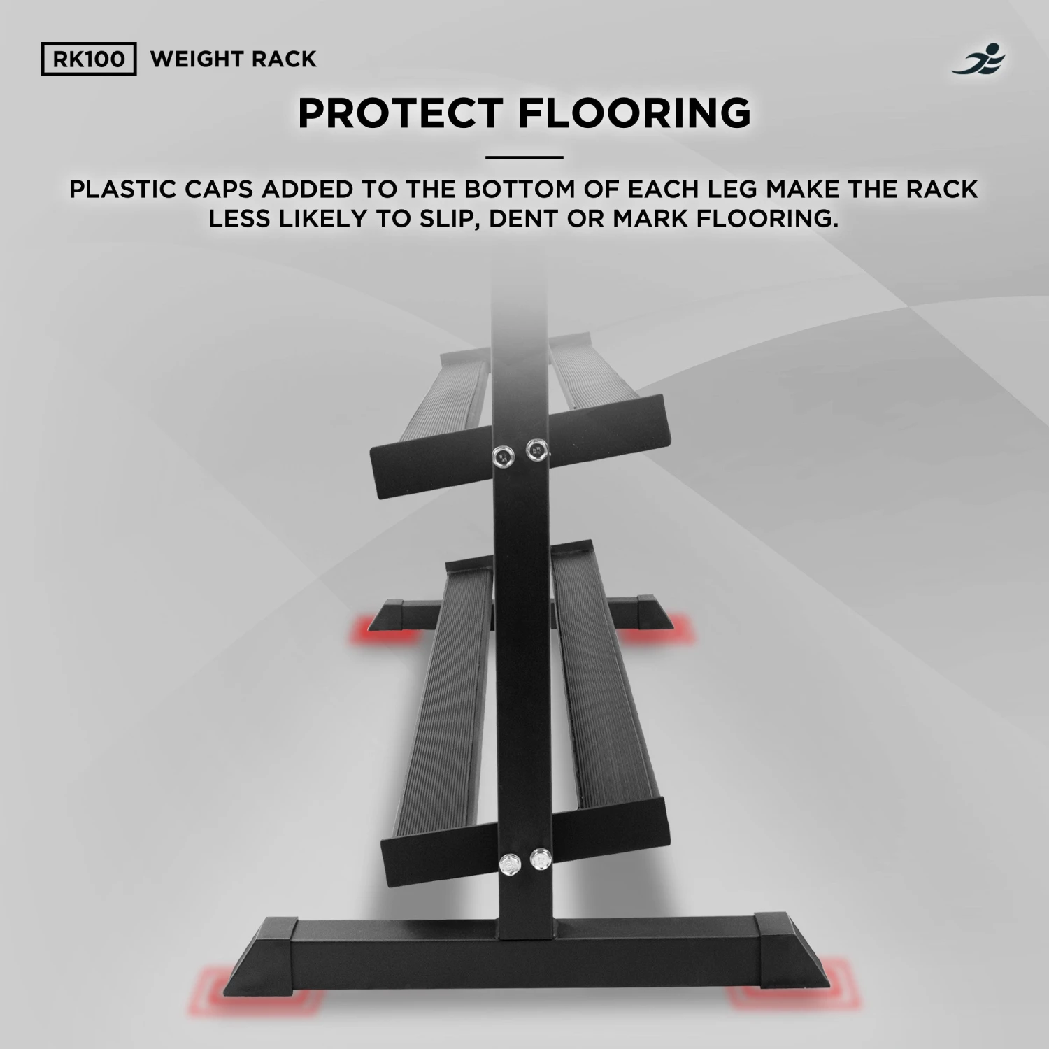 Designed to house a variety of weights, this rack is designed for both domestic and commercial use, making it the perfect addition to any gym. A matte black finish and rubber coating to each tier provide a safe and stable place to store your weight equipment. This stand also has plastic caps added to the bottom of each leg meaning it is less likely to slip, dent or mark flooring. Please Note: Weights are not included with this rack.