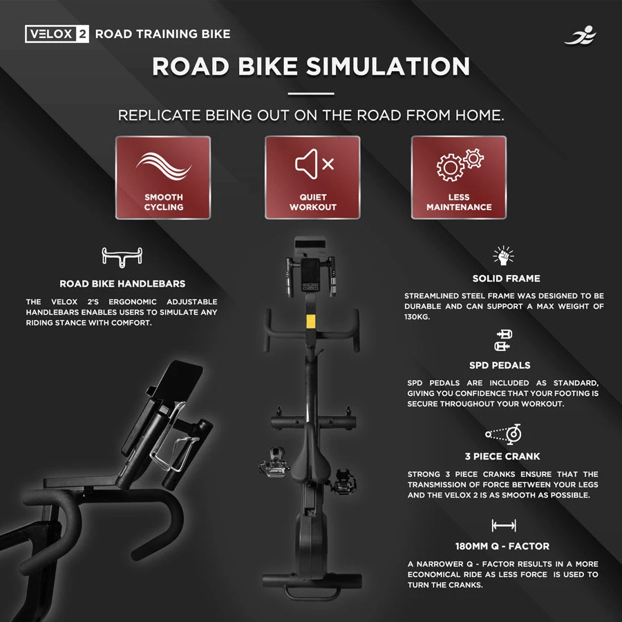 Optimised Q-Factor: With a Q-factor of 180mm, the Velox 2 ensures an ergonomic and natural pedalling motion. This optimal spacing between the pedals reduces the risk of knee strain and enhances overall cycling comfort, making your workouts more effective and enjoyable.