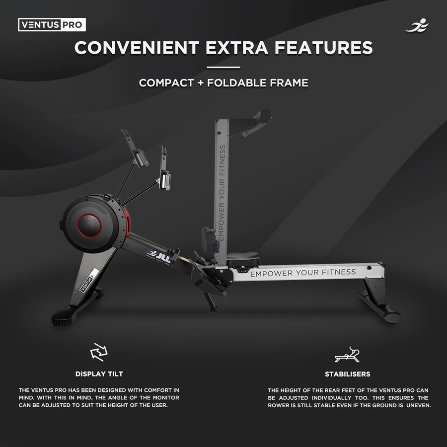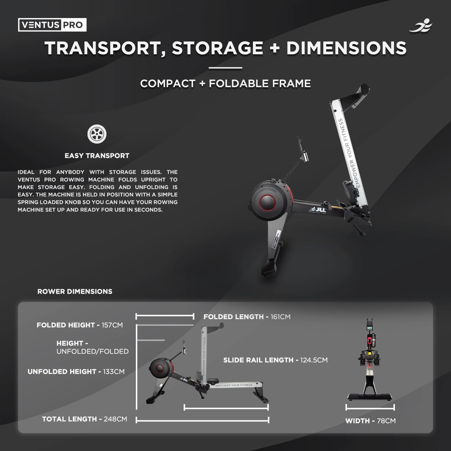 Designed for convenience and space efficiency, the JLL Ventus Pro can be easily folded and stored, making it an ideal addition to any home gym. The comfortable padded seat, adjustable footplates, and ergonomic handlebar ensure a comfortable and ergonomic rowing position, allowing you to focus on your performance without discomfort.
