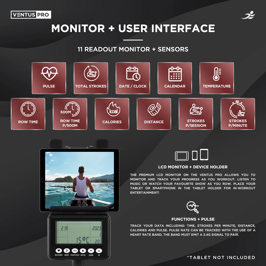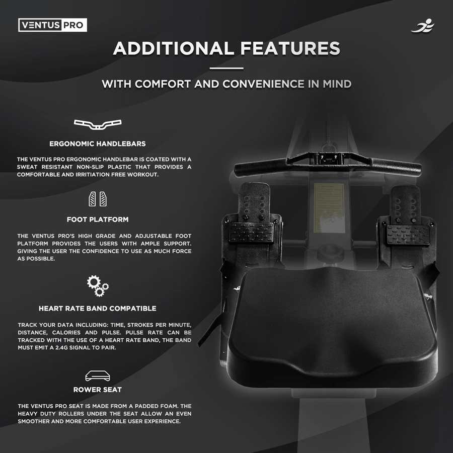 The Ventus Pro features an innovative air resistance system, providing dynamic and responsive resistance that adjusts to your effort level, ensuring a challenging workout every time. The 11-readout monitor keeps you fully informed of your progress, displaying key metrics such as time, distance, speed, calories burned, strokes per minute, and more, to help you stay motivated and on track with your fitness goals.